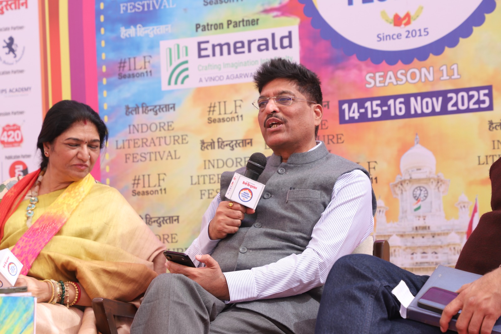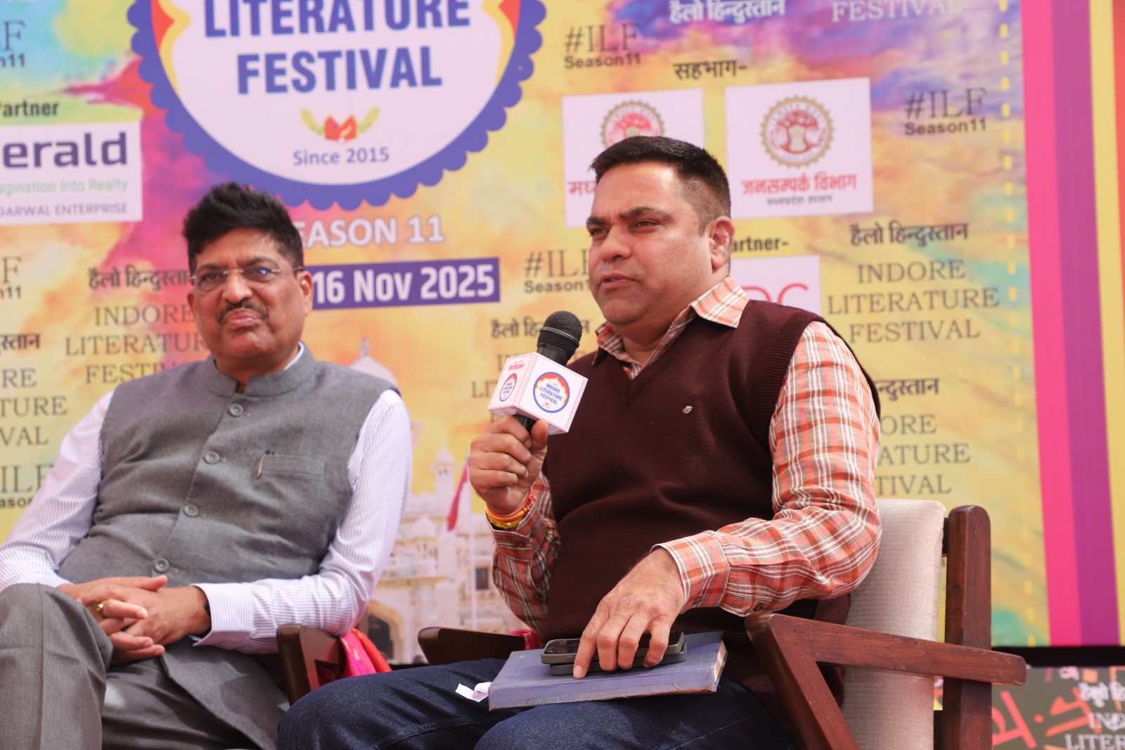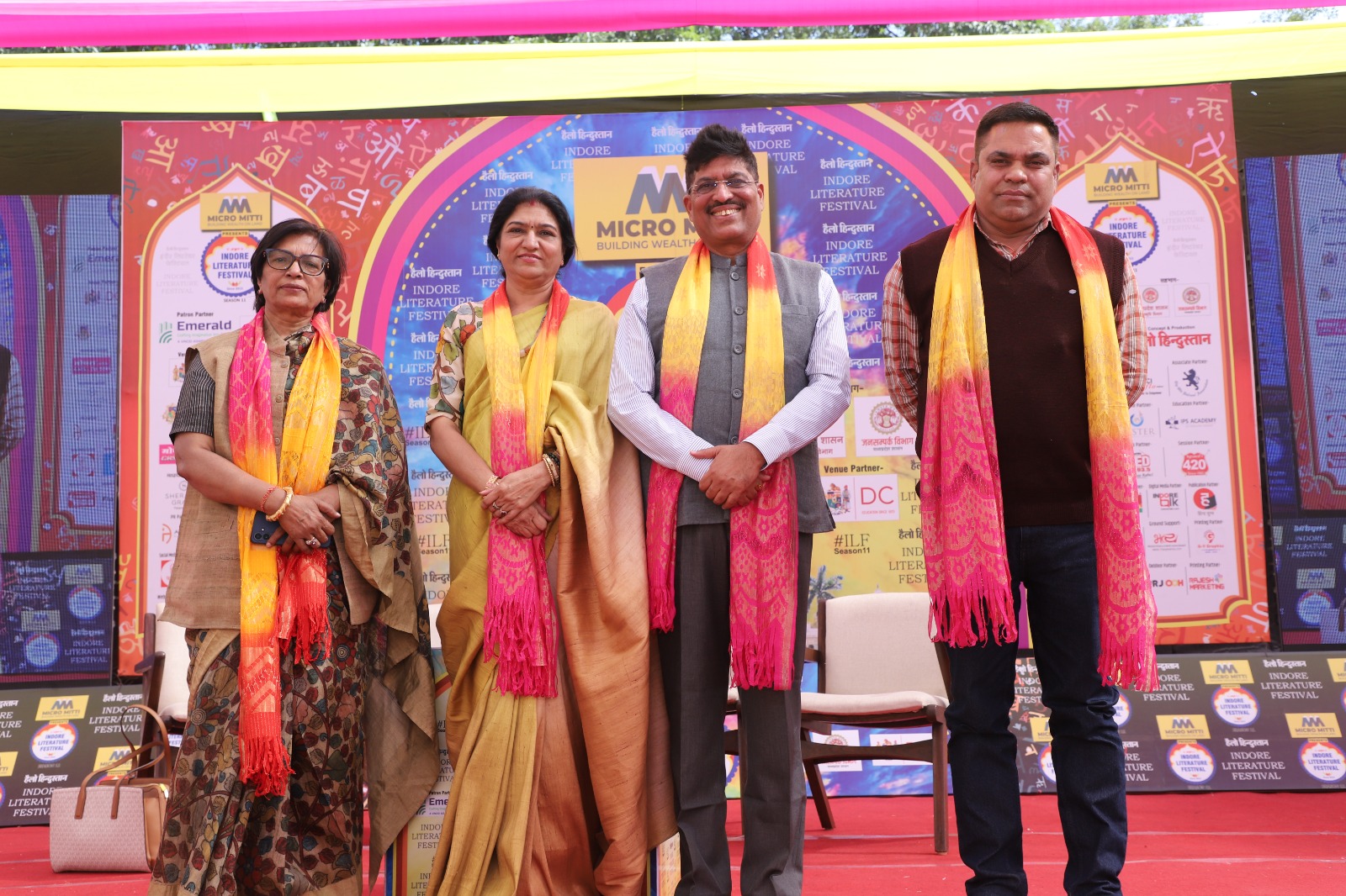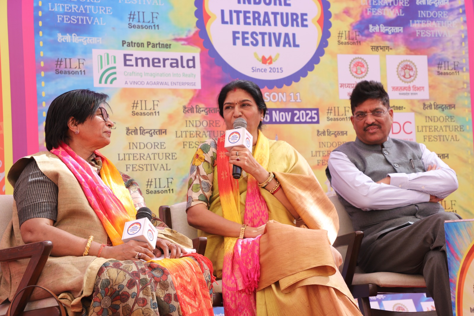 इंदौर लिटरेचर फेस्ट में आयोजित“मेरा रचना धर्म”सत्र में तीन विशिष्ट हस्तियों; डॉ. अजय भूषण शुक्ला, मुकेश जी नेमा और उर्मिला शिरीष, का स्वागत किया गया, जिन्होंने अपनी कविताओं, अनुभवों और संवेदनाओं से इस सत्र को बेहद सफल और यादगार बना दिया। कहीं सीख थी, कहीं भावुकता, कहीं व्यंग्य की चुटीली झलक और कहीं जीवन के गहरे अनुभव—इन सभी रंगों ने मिलकर पूरी दर्शक-दीर्घा को शुरू से अंत तक बाँधे रखा।