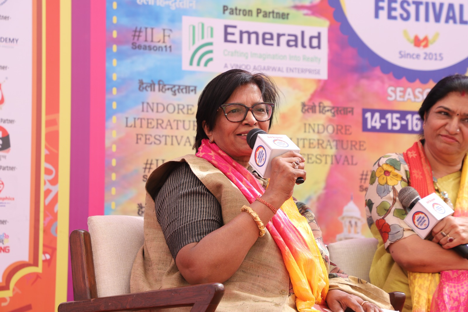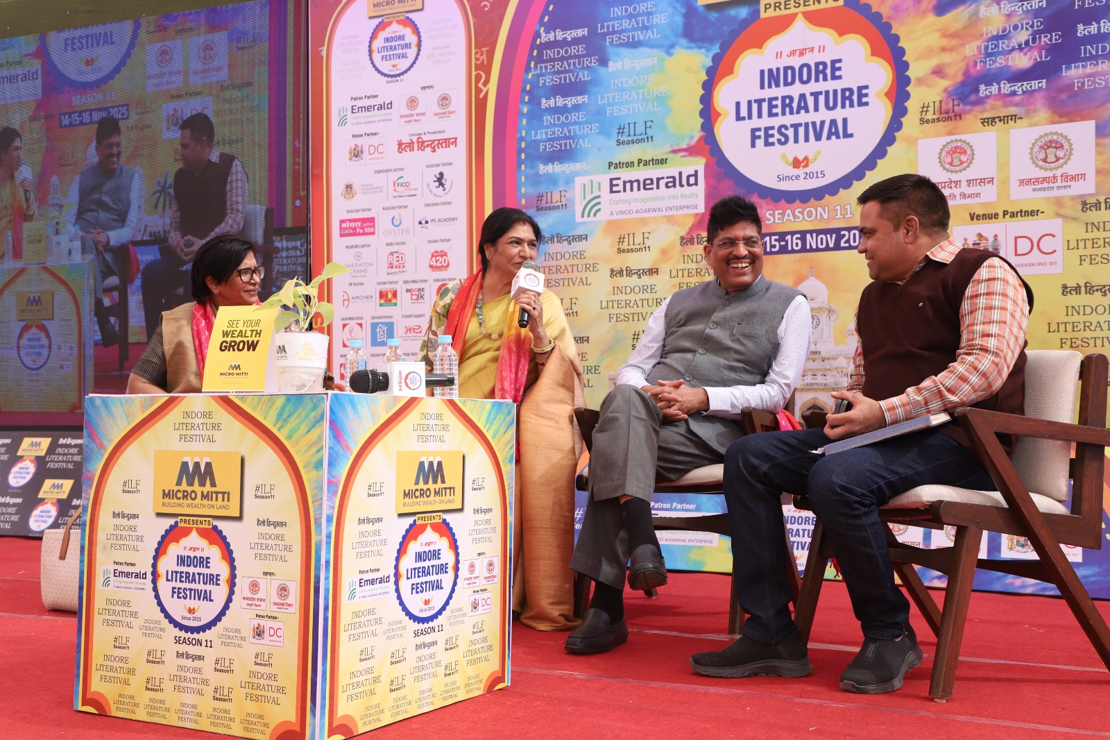 इंदौर लिटरेचर फेस्ट में आयोजित“मेरा रचना धर्म”सत्र में तीन विशिष्ट हस्तियों; डॉ. अजय भूषण शुक्ला, मुकेश जी नेमा और उर्मिला शिरीष, का स्वागत किया गया, जिन्होंने अपनी कविताओं, अनुभवों और संवेदनाओं से इस सत्र को बेहद सफल और यादगार बना दिया। कहीं सीख थी, कहीं भावुकता, कहीं व्यंग्य की चुटीली झलक और कहीं जीवन के गहरे अनुभव—इन सभी रंगों ने मिलकर पूरी दर्शक-दीर्घा को शुरू से अंत तक बाँधे रखा।